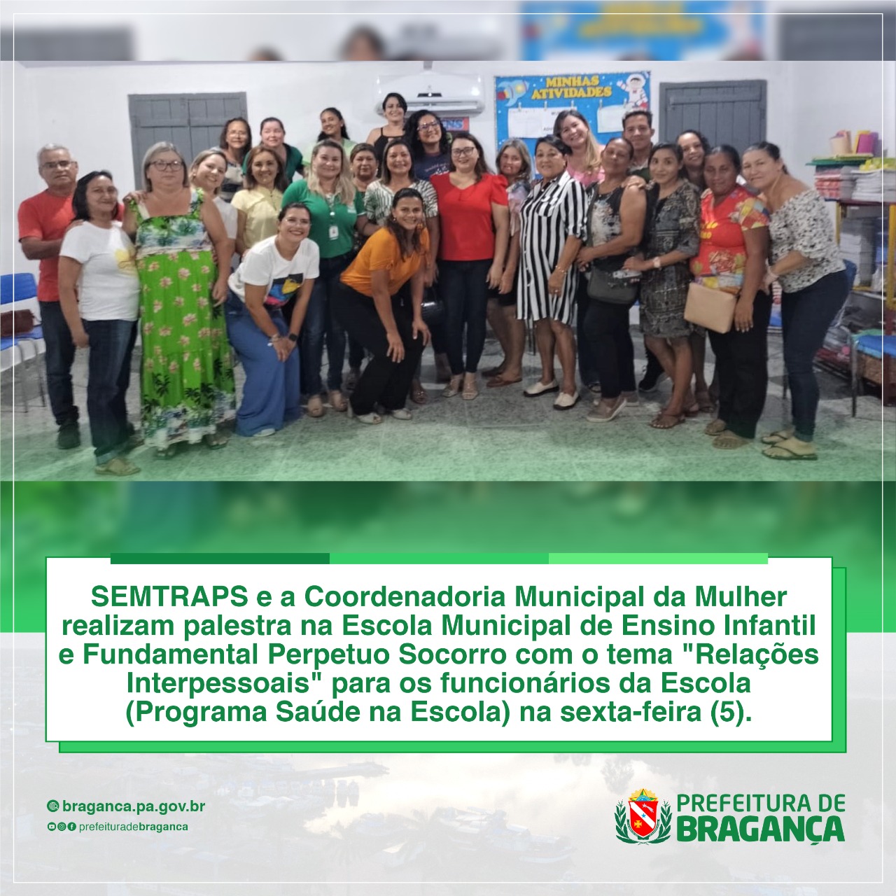 SEMTRAPS E A COORDENAÇÃO MUNICIPAL DA MULHER REALIZARAM PALESTRA NA ESCOLA MUNICIPAL DE ENSINO INFANTIL E FUNDAMENTAL PERPÉTUO SOCORRO COM O TEMA “RELAÇÕES INTERPESSOAIS” PARA OS FUNCIONÁRIOS DA ESCOLA (PROGRAMA SAÚDE NA ESCOLA) NA SEXTA-FEIRA (5).